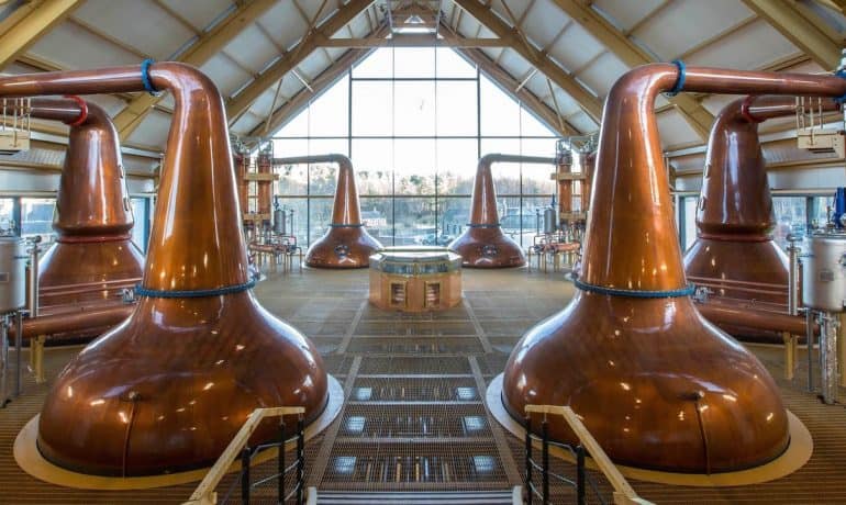- Destillering: Denna vätska destilleras minst två gånger (i Irland ofta tre) i kopparpannor, vilket koncentrerar alkoholen. Resultatet blir en rå whisky som fortfarande måste lagras för att utveckla sin karaktär.
